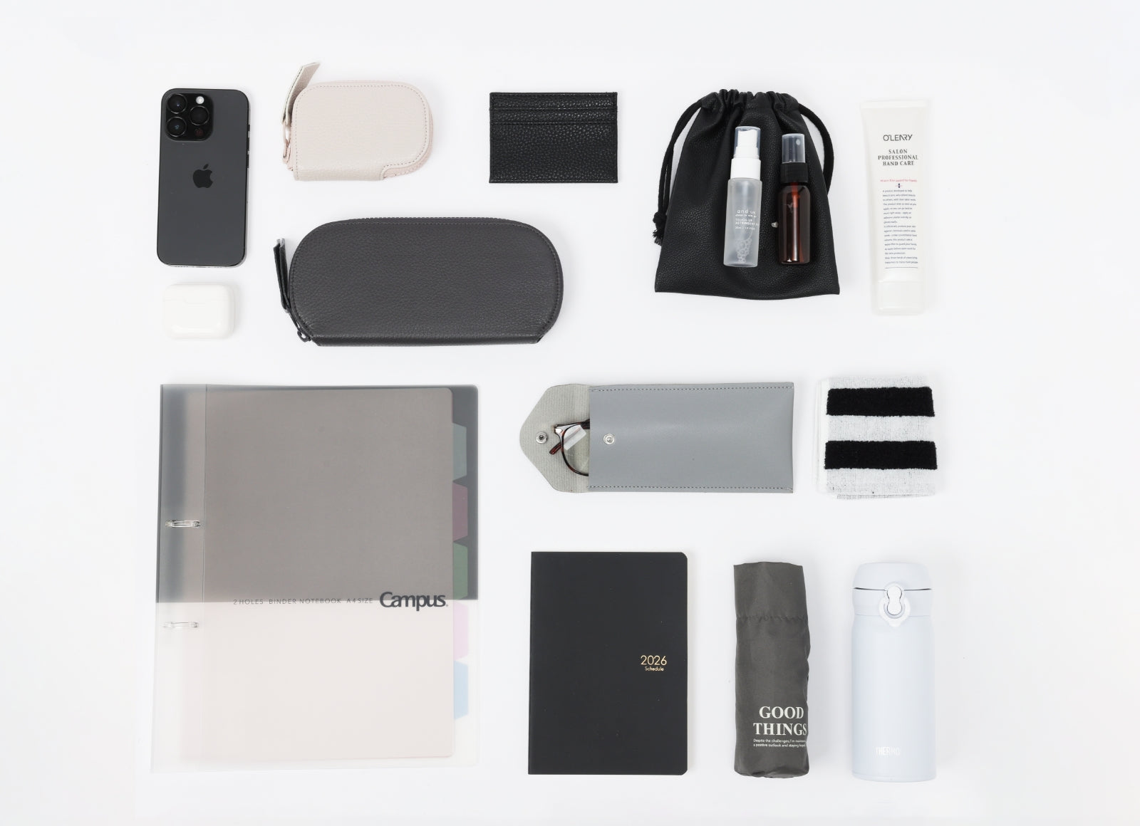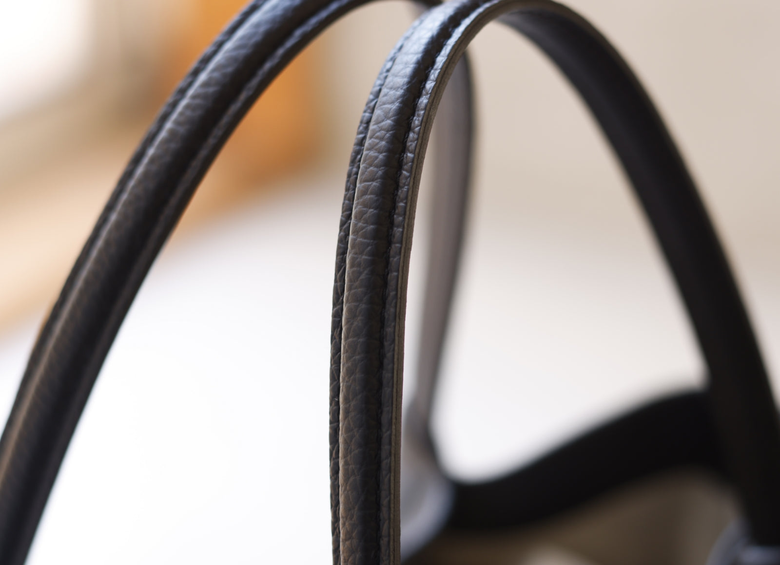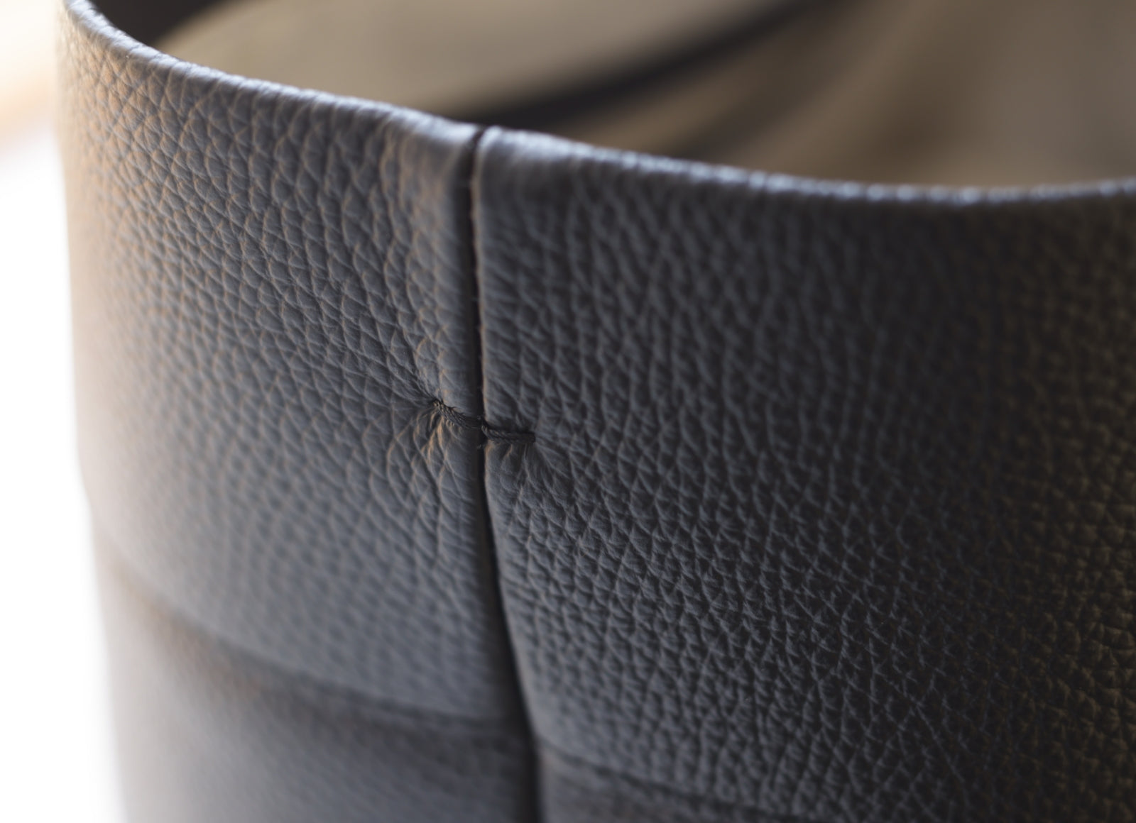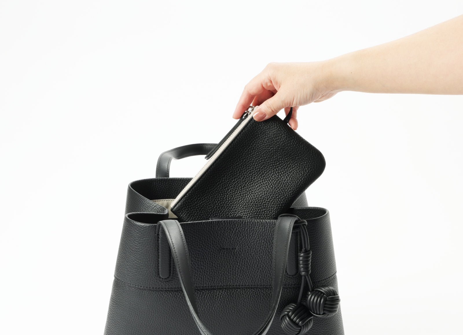 - 本体に使用しているのはイタリアで丁寧に鞣されたシュリンクレザー。シボが生む奥行きある表情と、手に吸いつくようなしっとりとした質感を特に追及しました。上質で落ち着いた佇まいが、日常にさりげない品格を添える素材です。