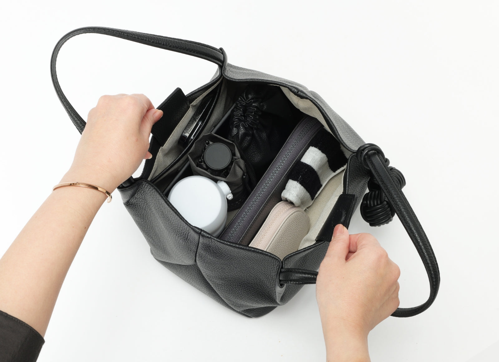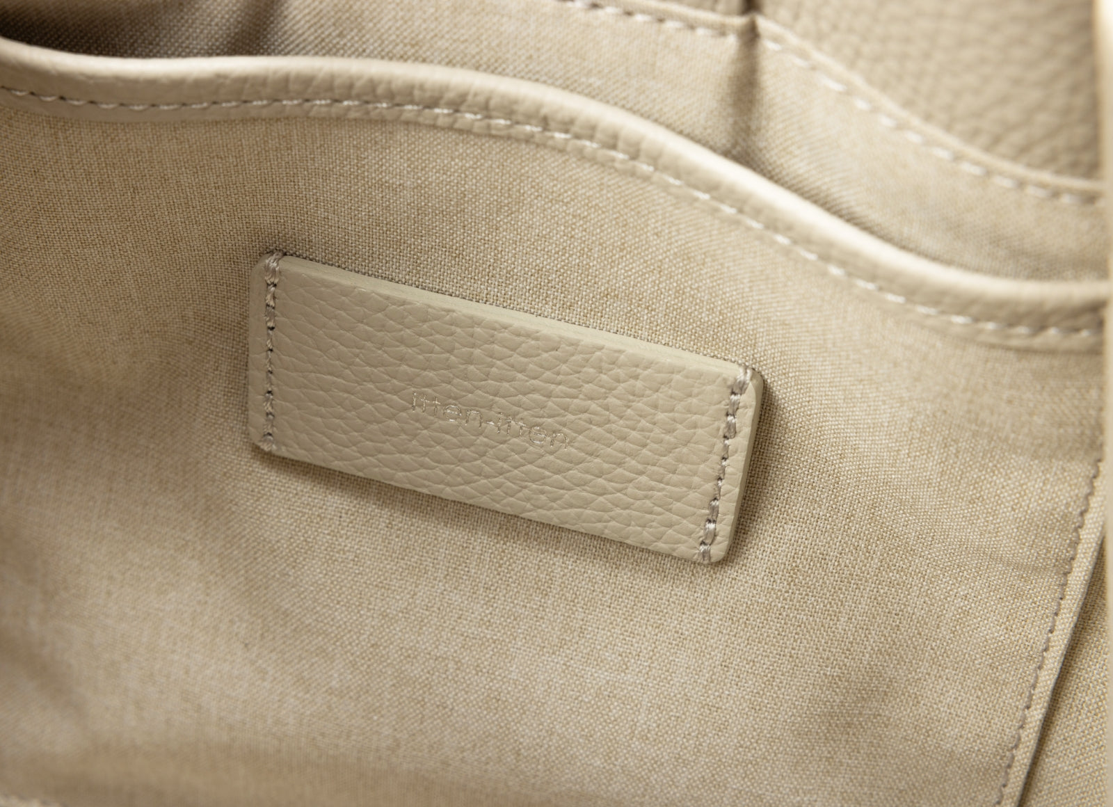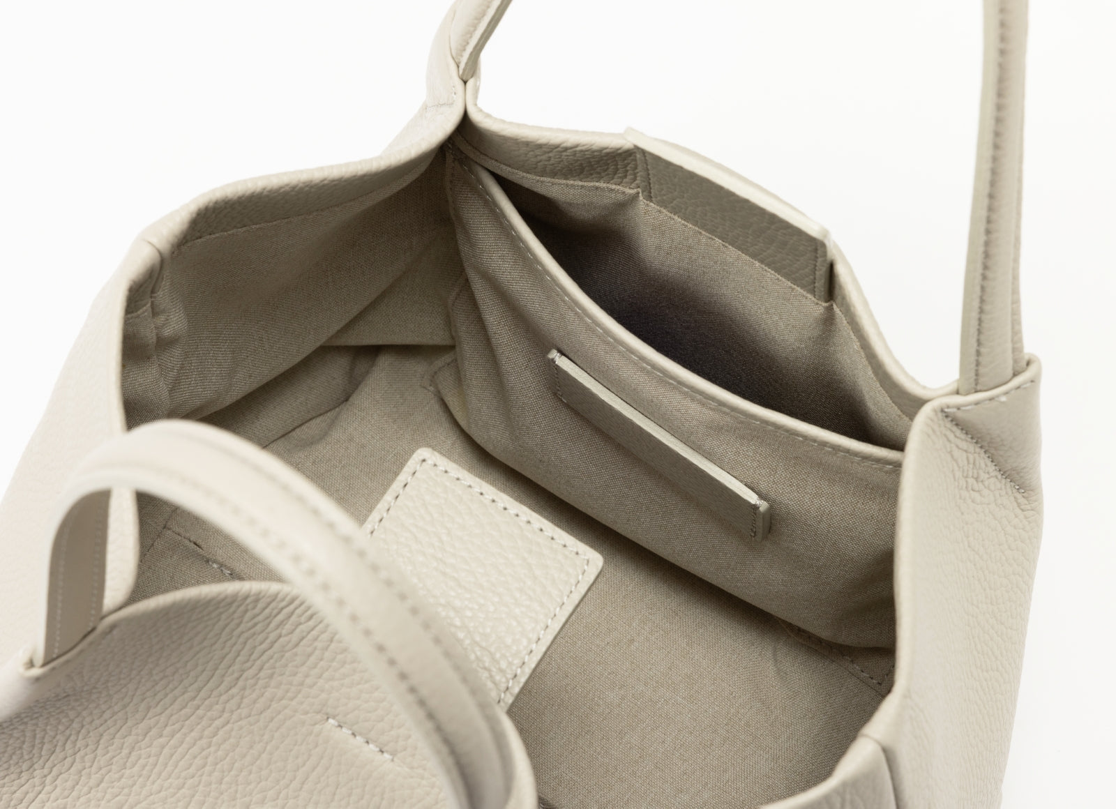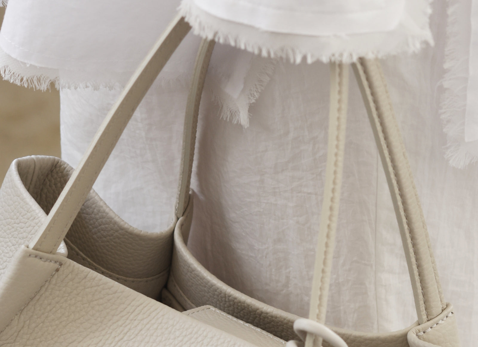 - 本体に使用しているのはイタリアで丁寧に鞣されたシュリンクレザー。シボが生む奥行きある表情と、手に吸いつくようなしっとりとした質感を特に追及しました。上質で落ち着いた佇まいが、日常にさりげない品格を添える素材です。