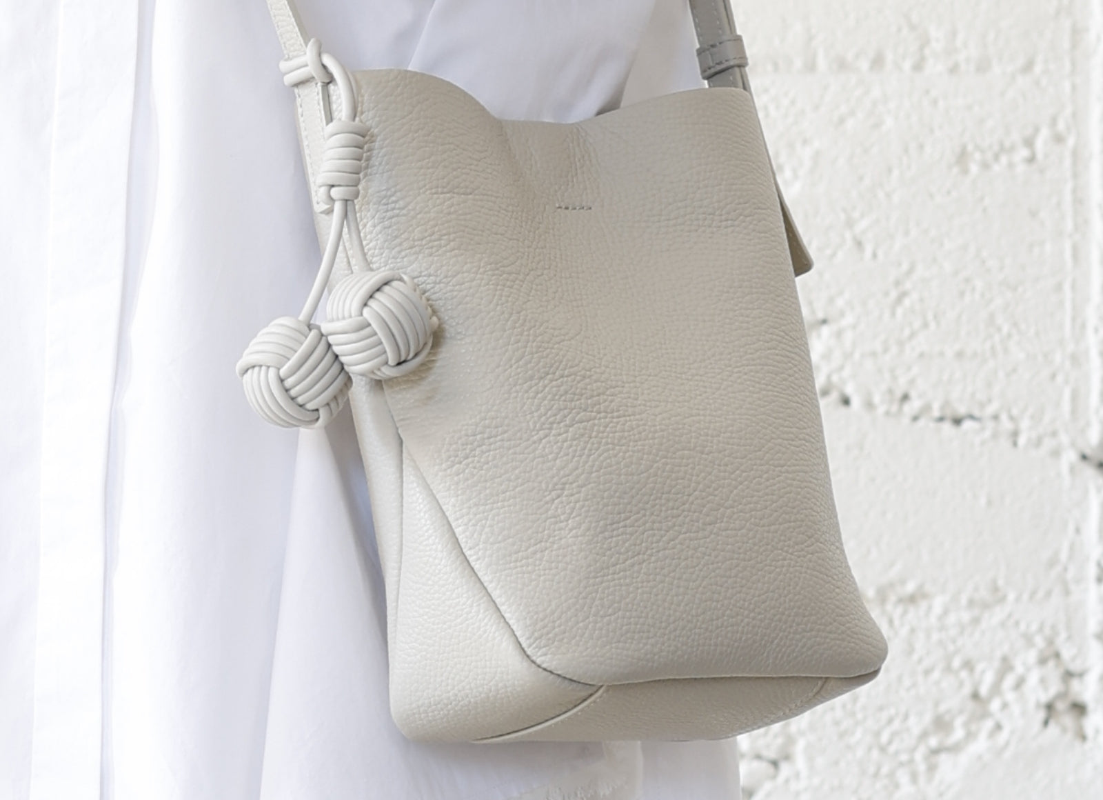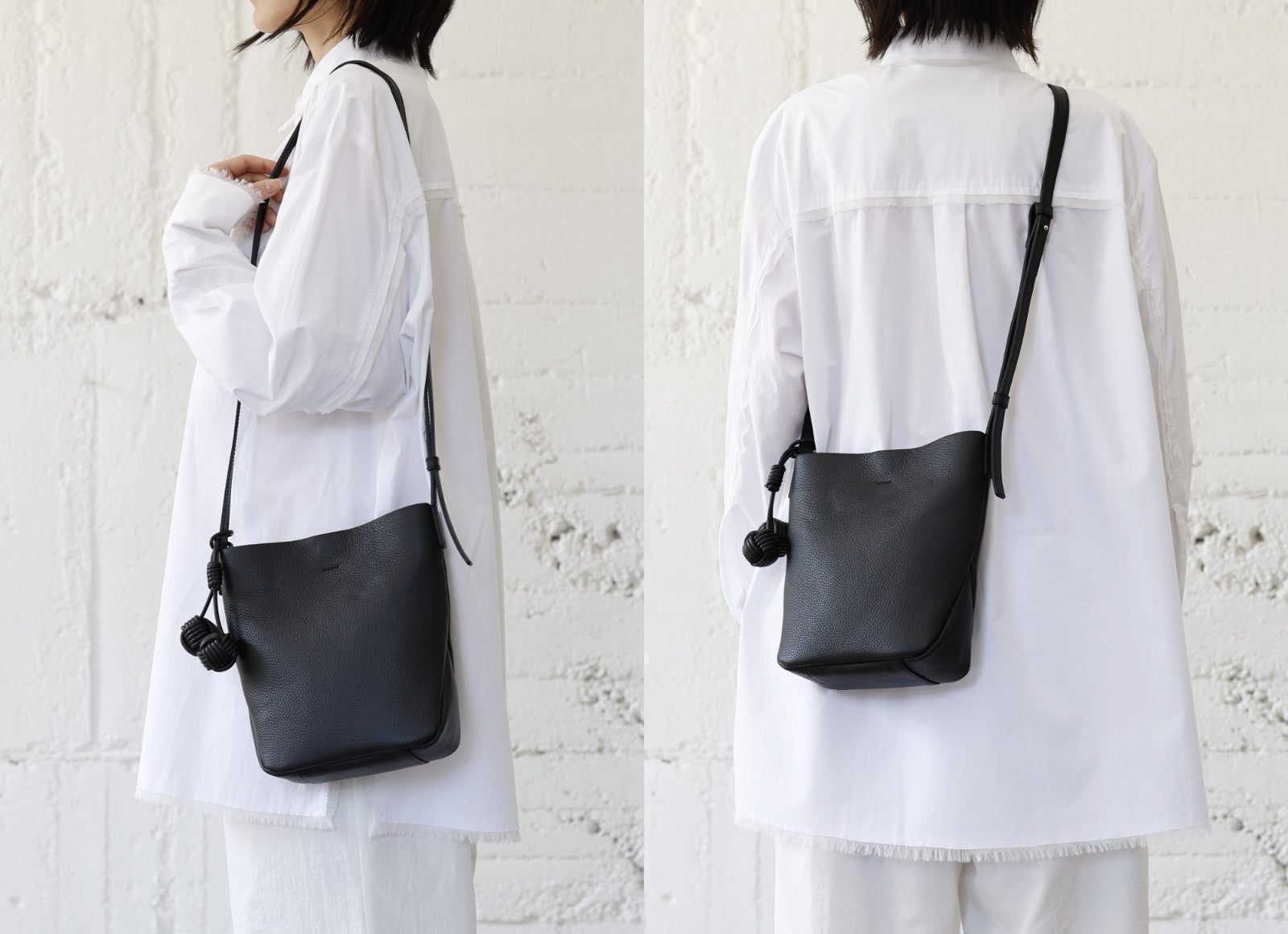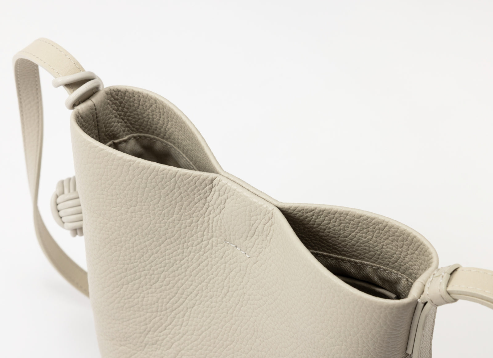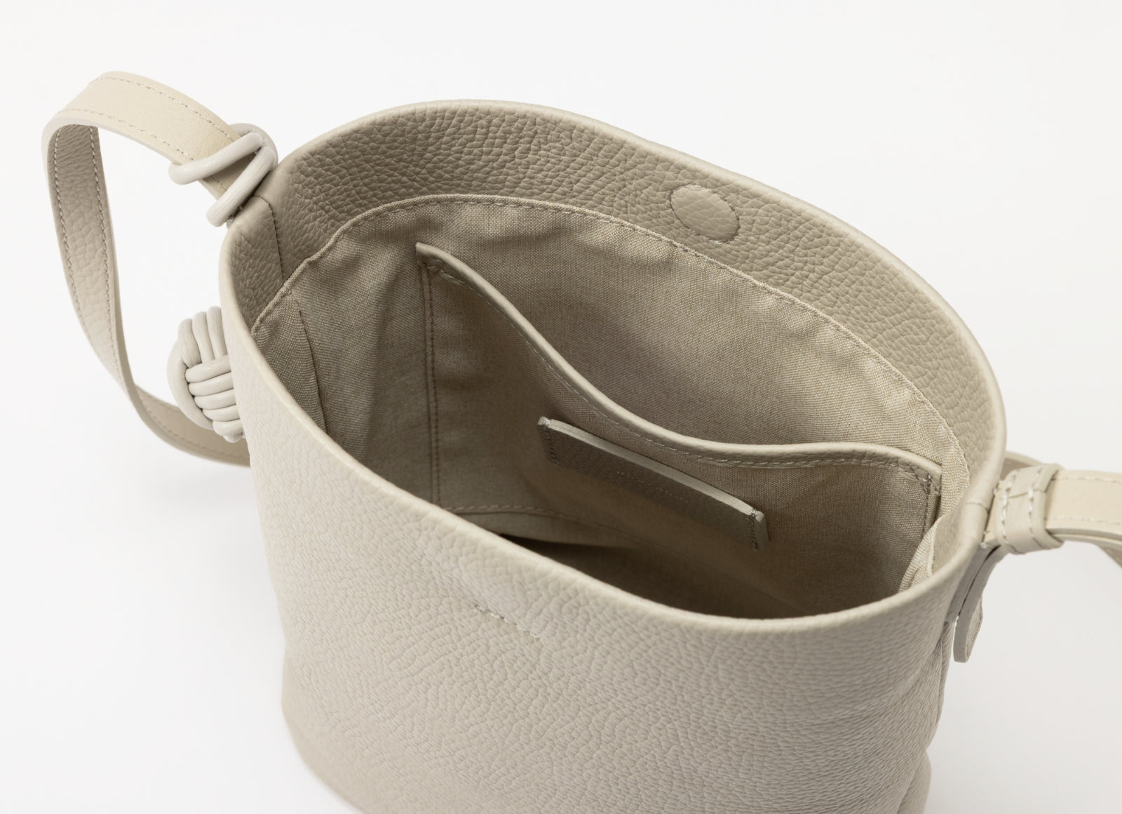- 本体に使用しているのはイタリアで丁寧に鞣されたシュリンクレザー。シボが生む奥行きある表情と、手に吸いつくようなしっとりとした質感を特に追及しました。上質で落ち着いた佇まいが、日常にさりげない品格を添える素材です。