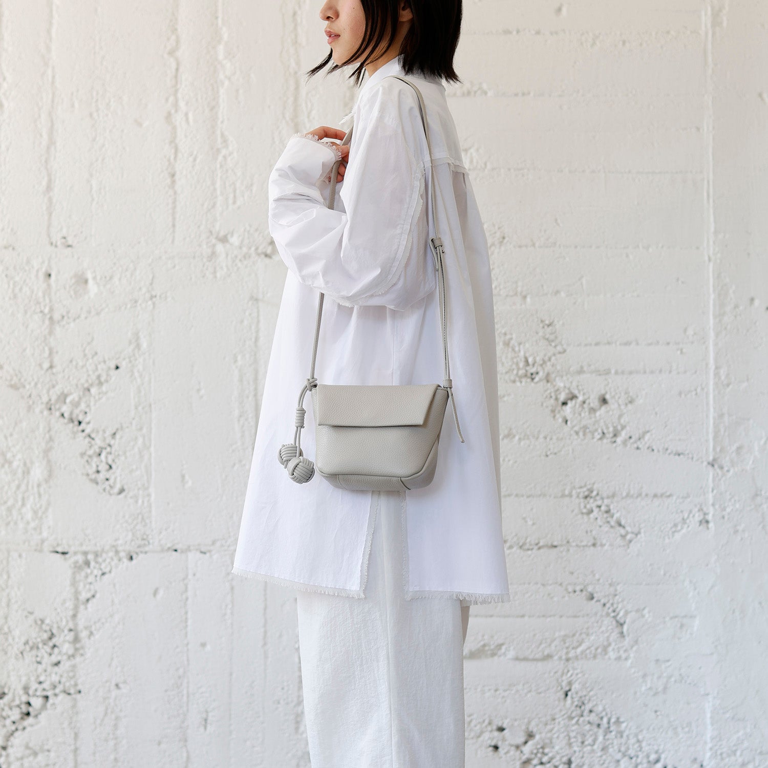 - 本体に使用しているのはイタリアで丁寧に鞣されたシュリンクレザー。シボが生む奥行きある表情と、手に吸いつくようなしっとりとした質感を特に追及しました。上質で落ち着いた佇まいが、日常にさりげない品格を添える素材です。